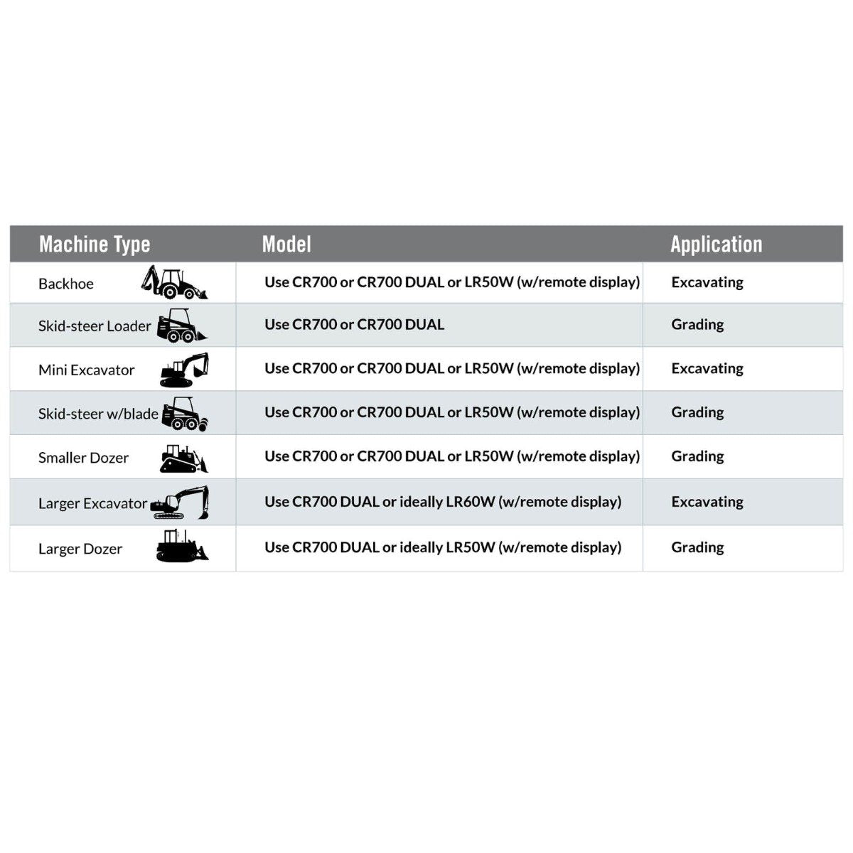 It is designed to be used with any Red Beam Rotary Laser Level (Fukuda, Topcon, Spectra etc...) and on 1T up to around 12-13T Excavators. Depending on your budget and usage, the CR700 can easily be used on larger plant, but is mainly intended for smaller machines up to 12T. Over this weight, there are compromises.